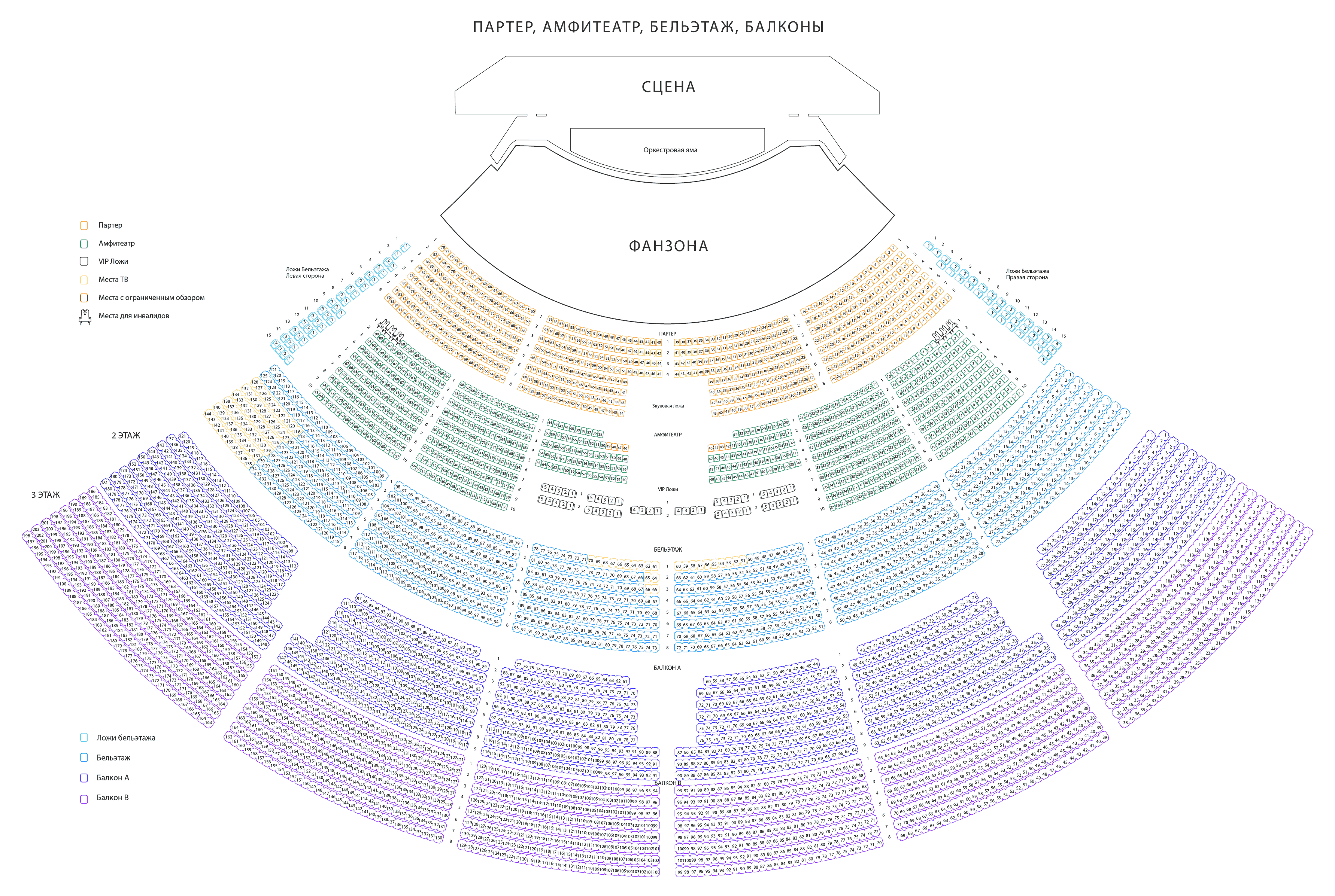 Для тех, кто любит с комфортом наблюдать за действием на сцене, будут предложены удобные кресла в партере, амфитеатре и на балконах. На сцене будет установлен видеоэкран, на котором будет транслироваться всё происходящее. Зрителям на балконах, будет хорошо видно все, что происходит на сцене.