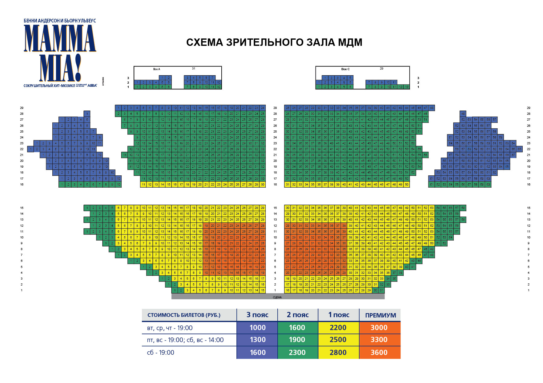 Мюзикл MAMMA MIA! идет в МДМ каждый день, кроме понедельника, по будням в 19.00, по выходным в 14.00 и в 19.00.