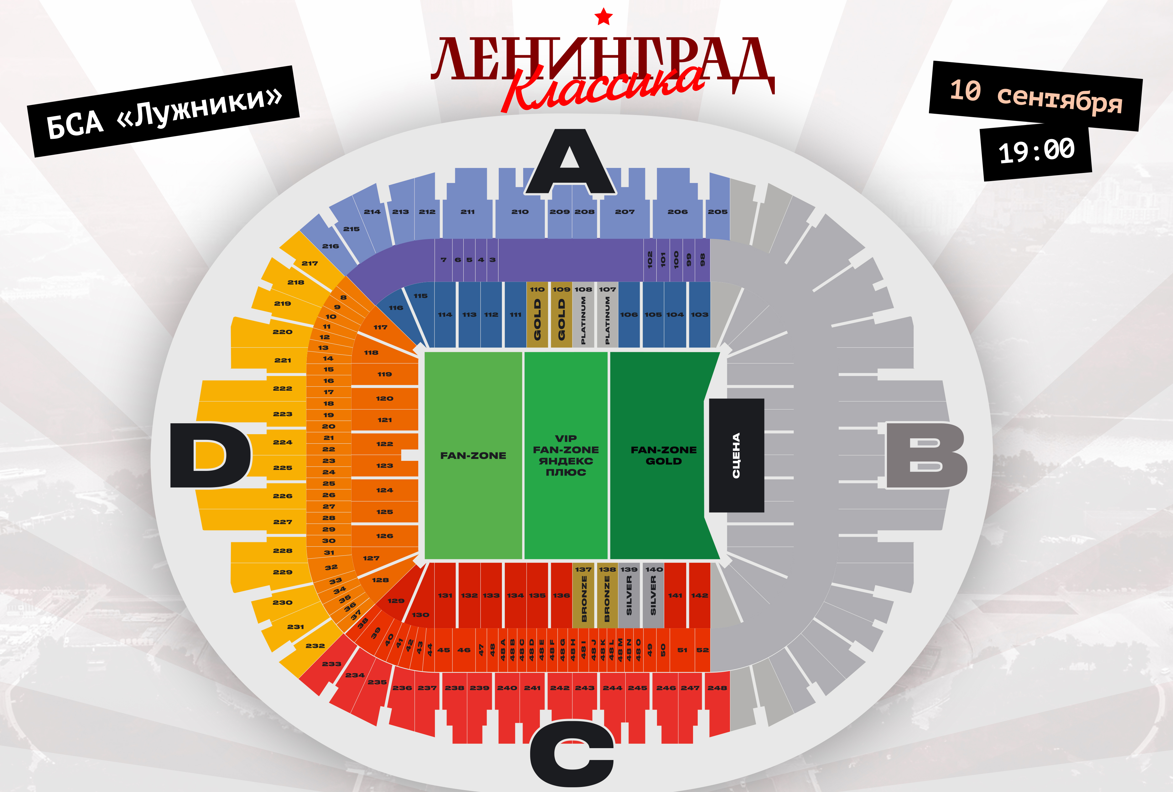 На секторах стадиона «Лужники» будут организованы четыре премиум-зоны: Bronze, Silver, Gold и Platinum - с питанием, напитками и другими преимуществами в зависимости от статуса. На танцполе будут выделены три специальные зоны: Fan-zone, VIP Fan-zone Яндекс Плюс и Fan-zone Gold. Самые взыскательные зрители смогут уединиться в вип-ложах с отдельным входом и насладиться не только музыкой, но и кухней от премиального кейтеринга, винной и барной картами.