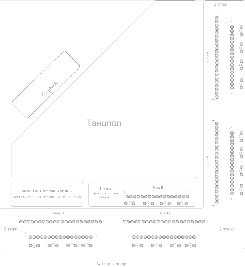 В сектор "Билет на танцпол + MEET & GREET с NKEEEI x UNIQE x ARTEM SHILOVETS (2 сентября, 18:40)" входят следующие опции: