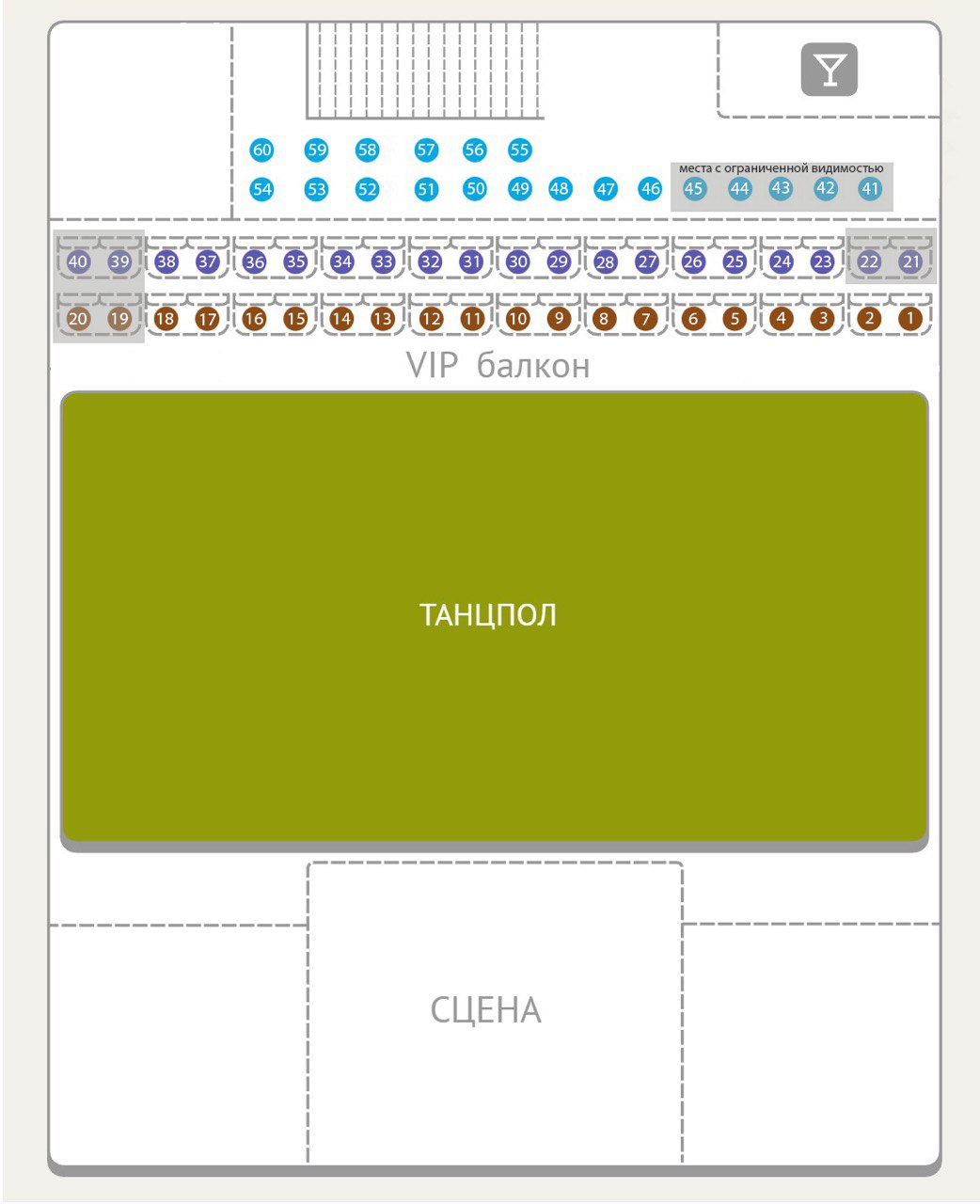 VIP Балкон - комфортные диваны в ВИП-зоне, отдельный туалет, бар.