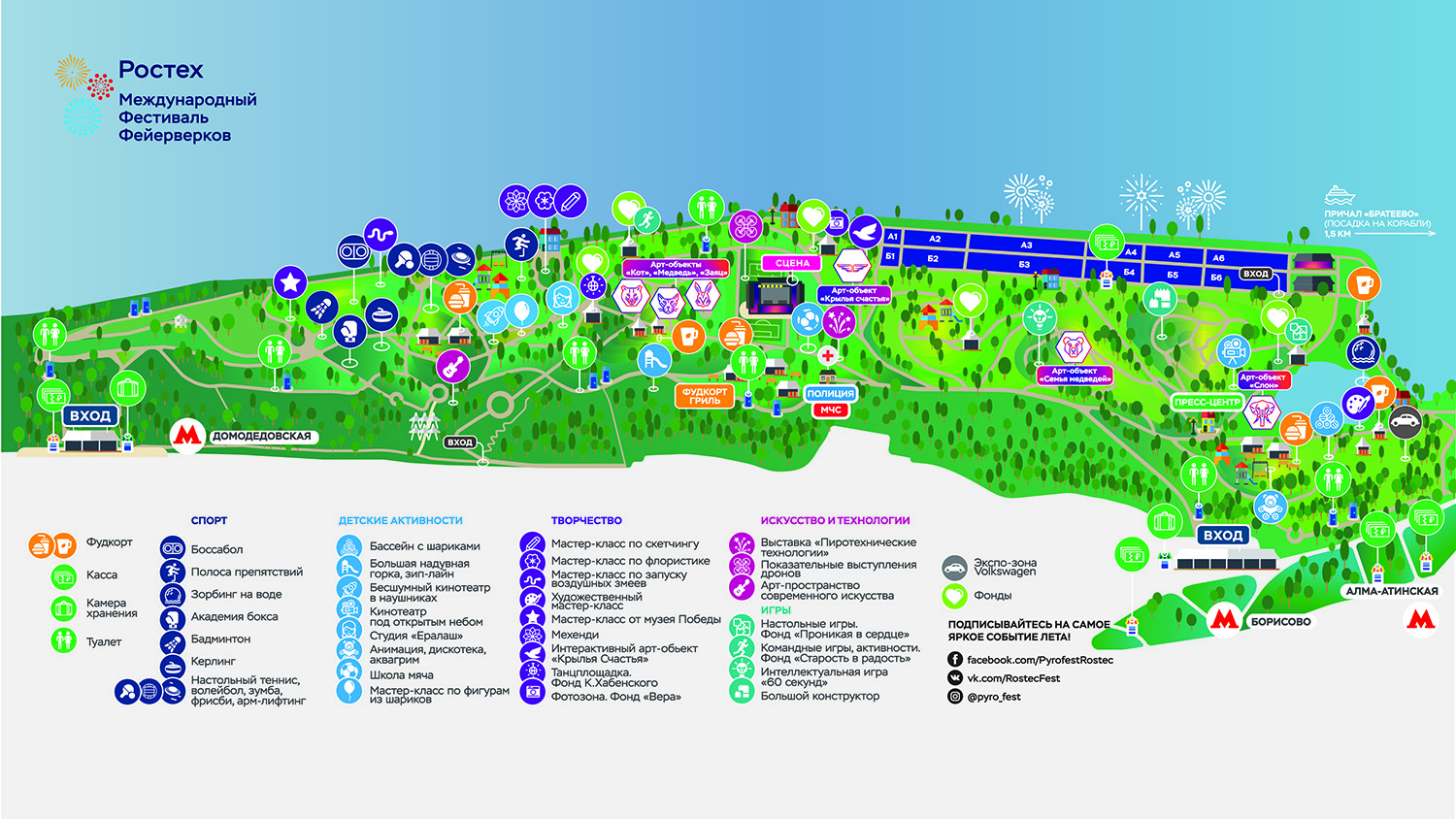 ВНИМАНИЕ! Причал находится не менее чем в 15 минутах пешком от метро «Алма-Атинская». Пожалуйста, приезжайте заблаговременно. Посадка осуществляется строго с 19.00 до 20.00. Причал находится за территорией Братеевского парка, в котором проходит дневная программа фестиваля (в 15 минутах пешком).