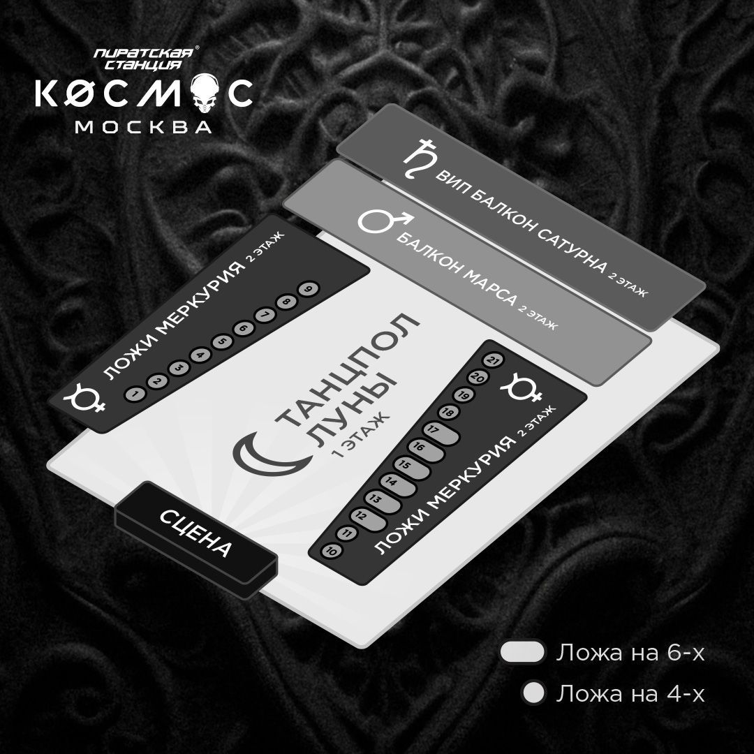 ВИП Балкон Сатурна - все привилегии «Танцпола Луны» и «Балкона Марса», место за столиком на одном из ярусов каскадной части балкона с премиальным видом на сцену и индивидуальным обслуживанием официантами, VIP-вход.