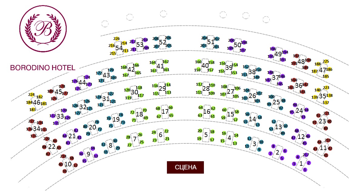 Зал включает пять рядов столов, рассчитанных на четыре персоны, и несколько столов, рассчитанных на пять персон. Приобрести можно билеты даже на одно посадочное место.