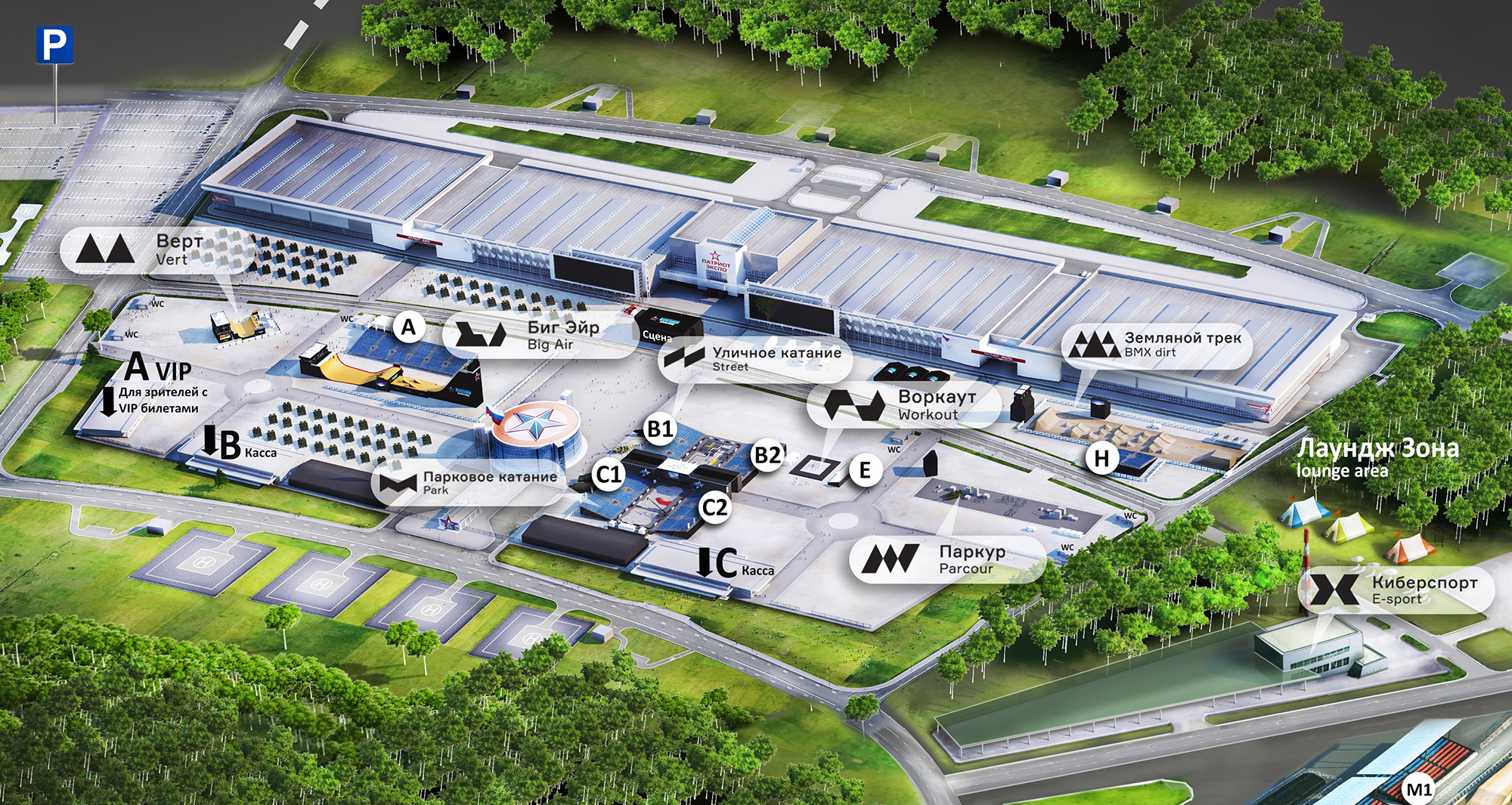 Парковка парка "Патриот". Дает право парковать транспортное средство на 1 день непосредственно на территории проведения мероприятия. Парковка "Алабино". Дает право парковать транспортное средство на 1 день. От парковки в Алабино до парка "Патриот" курсируют бесплатные автобусы.